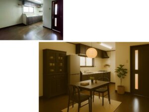 ダイニングキッチンは統一感のあるダークブラウンの家具と温かみのある照明で、「落ち着いた大人のダイニングキッチン」を表現。