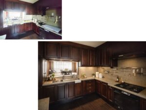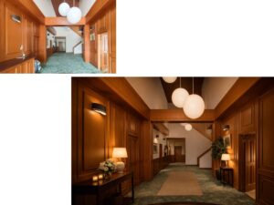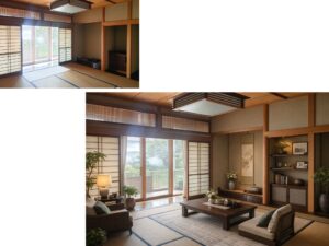 重厚感のある木部と、柔らかな光に包まれる空間構成が、落ち着きと品格を演出しています。